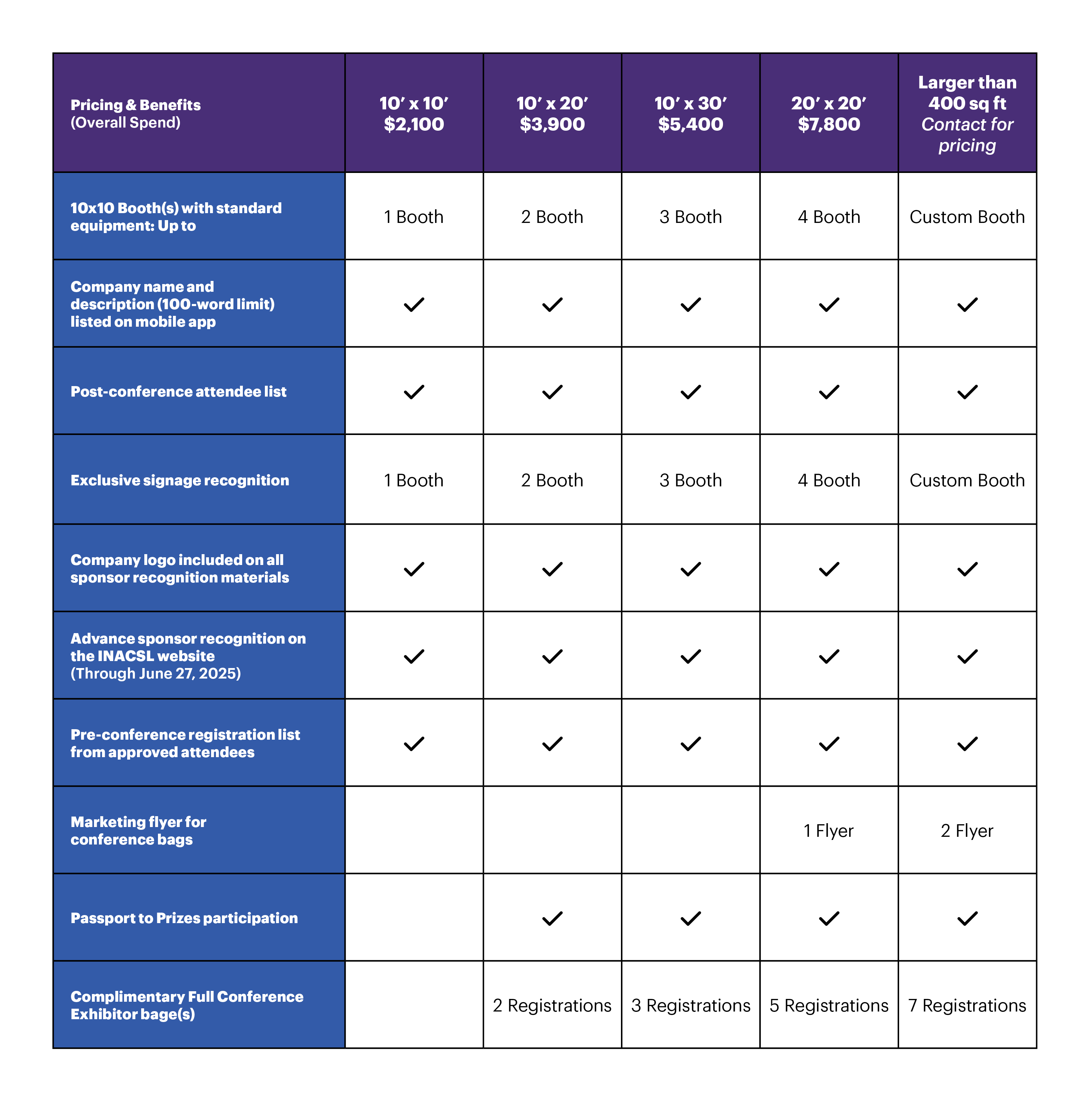 Submit your exhibitor contract todayINACSL26 Exhibit HoursWednesday, June 10, 2026 7:00 a.m. - 4:00 p.m. | Exhibitor Move-In Sponsorship Packages — Pricing & BenefitsINACSL offers a wide array of sponsorship packages to align with your company's goals and level of investment. View the table below for a detailed breakdown of the valuable benefits offered with each sponsorship level available at INACSL26.